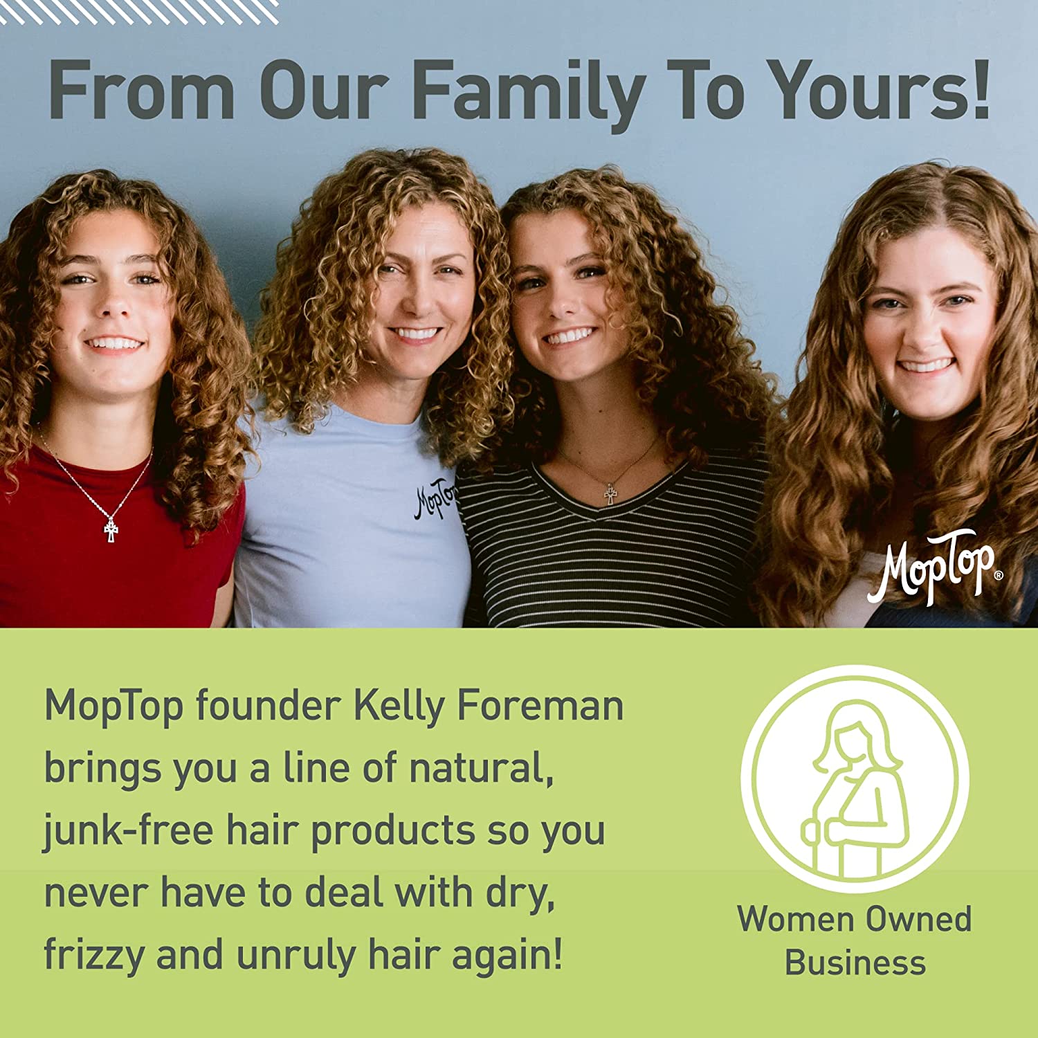 MopTop started in 2005 when our founder Kelly set out to tame her own curls—and help others do the same. What began as a personal mission turned into a curl-loving brand that’s trusted and loved by waves, curls, and coils everywhere. Made in the USA with only the good stuff (no silicones, dyes, or junk), our products smell amazing and actually work—because your curls deserve nothing less.