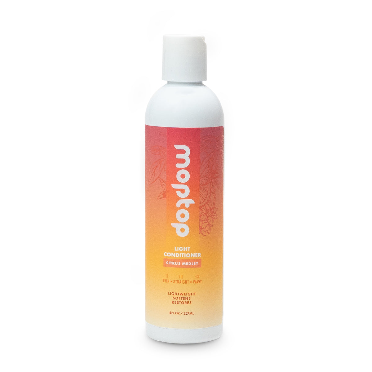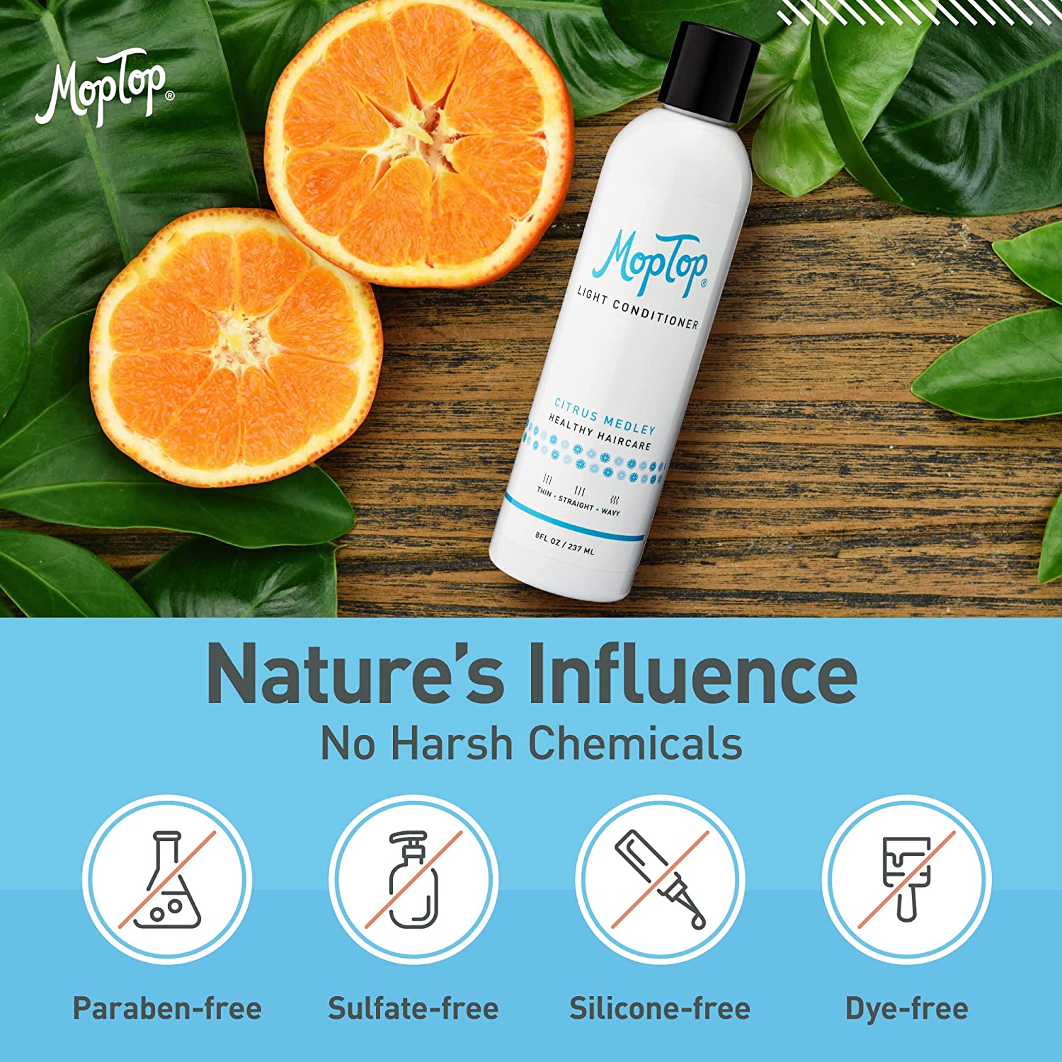 MopTop Light Conditioner for thin, straight or wavy hair conditions oily, normal, dry and color-treated hair, restoring moisture and manageability to frizzy hair with a lighthearted feel! This lightweight conditioner will leave you loving and embracing your soft, smooth hair.
